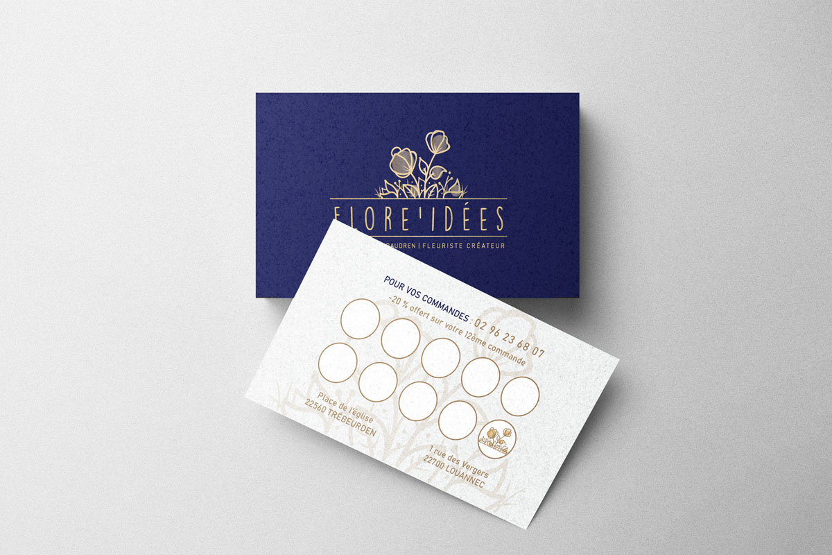 L’identité visuelle reflète la créativité, la fraîcheur et la sensibilité de Flore Idées avec une note d’élégance. La carte de fidélité quant à elle reprend les codes de son identité florale et fidélise ses clientes.